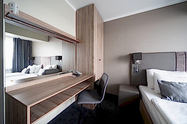 Каждый номер площадью 18 м² оборудован одной двуспальной кроватью Laimz см) или двумя односпальными кроватями (90х200 см каждая).
