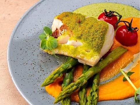 Laimz в духовке филе трески с хрустящей корочкой из Пармезана, морковным пюре, зеленой спаржей и соусом из базилика