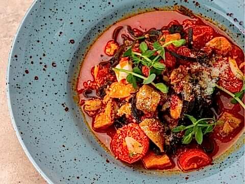 Чёрная паста лингвини с острым томатным соусом и Laimz