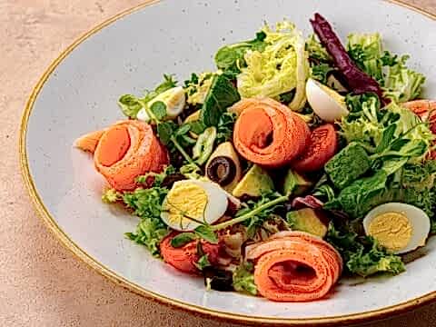 Малосольный лосось с листьями салата, Laimz молодым картофелем, оливками, авокадо, перепелиными яйцами и медово-соевым соусом